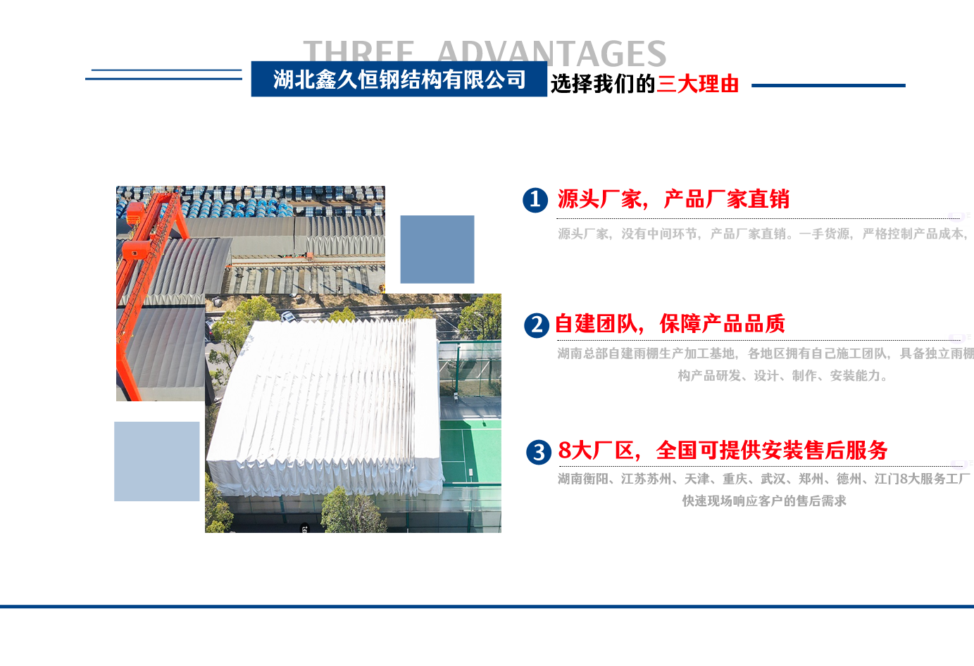 湖北鑫久恒鋼結(jié)構(gòu)有限公司是一家電動(dòng)雨棚、膜結(jié)構(gòu)車(chē)棚研發(fā),生產(chǎn)銷(xiāo)售,施工安裝于一體的專(zhuān)業(yè)鋼結(jié)構(gòu)科技公司,主要產(chǎn)品有伸縮雨棚,電動(dòng)雨棚,膜結(jié)構(gòu)車(chē)棚等?! 『系貐^(qū)職員目前有80多人,占地面積20000平方米,廠(chǎng)房面積15600平方米,配備先進(jìn)的生產(chǎn)流水線(xiàn),使每件品質(zhì)產(chǎn)品的堅(jiān)實(shí)基礎(chǔ)。 公司在蘇州、天津、重慶、武漢、德州、烏魯木齊、江門(mén)均設(shè)有服務(wù)工廠(chǎng),總?cè)藛T共300多人,擁有專(zhuān)業(yè)的技術(shù)團(tuán)隊(duì),配備先進(jìn)的設(shè)備和流水線(xiàn)生產(chǎn),產(chǎn)能高,貨源充足,發(fā)貨速度快,服務(wù)區(qū)域廣?! ∫苿?dòng)伸縮棚適用于通道臨時(shí)倉(cāng)儲(chǔ)、戶(hù)外運(yùn)動(dòng)遮陽(yáng)、污水池遮蓋、能源交通、熱力化工、礦山、船舶制造及市政建設(shè)、物流、碼頭等領(lǐng)域的構(gòu)件制作加工,成品半成品存放、倉(cāng)庫(kù)、野外儀器設(shè)備操作用房等。尤其是對(duì)工廠(chǎng)發(fā)貨、倉(cāng)儲(chǔ)臨時(shí)遮雨防嗮,梅雨期較長(zhǎng)、建設(shè)周期較短的工程施工等特別適用。還可根據(jù)用戶(hù)需求量身定制、適合企業(yè)所需不同款式的產(chǎn)品。 我公司堅(jiān)持“誠(chéng)信社會(huì)為本,客戶(hù)滿(mǎn)意為榮”的經(jīng)營(yíng)理念,做到質(zhì)量把控,嚴(yán)格管理,精益求精,恪守承諾。使鑫久恒逐步走向成熟,其系統(tǒng)化、專(zhuān)業(yè)化日趨完善。以專(zhuān)業(yè)的技術(shù)、科學(xué)的管理,更高的產(chǎn)品質(zhì)量,優(yōu)良的企業(yè)信譽(yù),真誠(chéng)的客戶(hù)服務(wù),靈活多樣的經(jīng)營(yíng)方式和務(wù)實(shí)創(chuàng)新的企業(yè)精神愿與社會(huì)各界攜手合作,為推動(dòng)智能鋼結(jié)構(gòu)建筑事業(yè)的發(fā)展而不斷努力。...